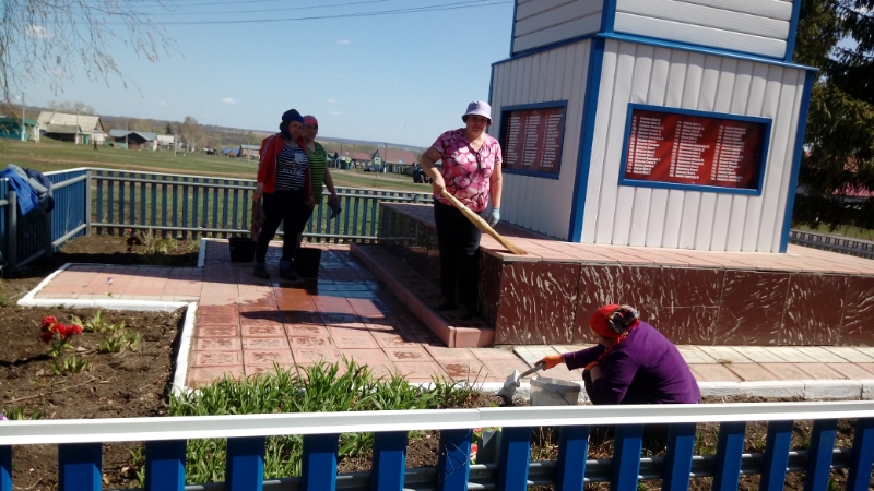 9 Май бәйрәме алдыннан өмә үткәрелде. Бюджет өлкәсе хезмәткәрләре Бөек Ватан сугышында катнашучыларга һәйкәл территориясен җыештырырга чыктылар.